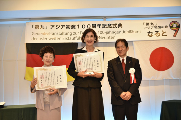 ブルーノ・ハーケ氏がご高齢のため、スザンネ・ハーケ氏が代理で受け取られました。ブルーノ・ハーケ氏は「第九」アジア初演を裏付ける資料を始めとする貴重な資料の寄贈のほか、「ばんどうの鐘」建設への寄付や、ドイツ兵の方々が帰国後結成していた「バンドー会」の再結成など、鳴門市との交流の窓口としても尽力されました。
