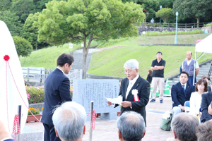 続いて、ドイツ兵慰霊碑の建立に携わっていた元ドイツ兵のゲオルグ・プフルーガー・シニア氏の孫であるステファン・プフルーガー氏より、長きに渡りドイツ兵慰霊碑の清掃を続けられている髙橋 敏夫氏へ、感謝の言葉が送られました。