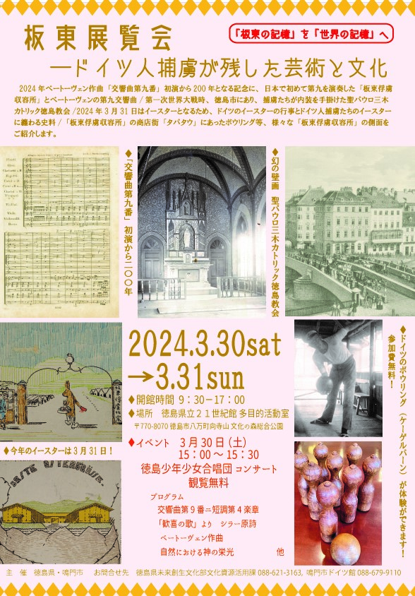 2024年がベートーヴェン作曲「第九」初演200周年となる記念に、日本で初めて「第九」全楽章を演奏した「板東俘虜収容所」とベートーヴェンの「第九」や、第一次世界大戦時、捕虜たちが内装を手掛けた聖パウロ三木カトリック徳島教会など、様々な「板東俘虜収容所」の側面を紹介します。